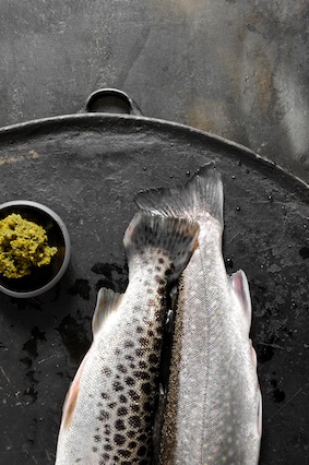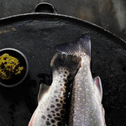 Gebeizte Lachsforelle auf weißem Bohnenmus mit Petersiliensalat